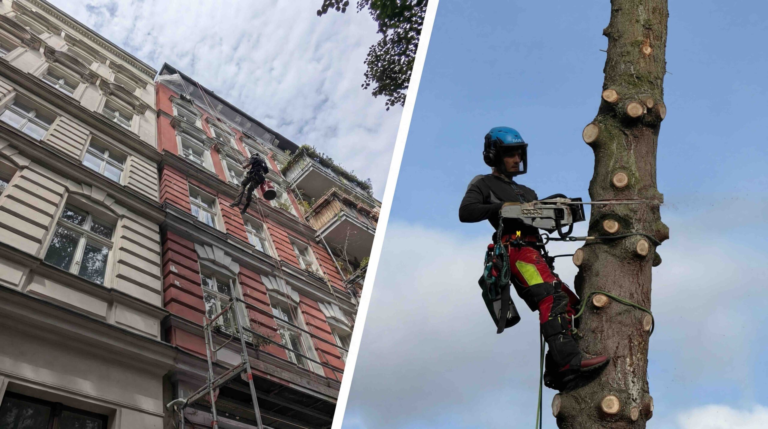 Wir übernehmen Arbeiten in Höhe an Gebäuden, Fassaden, Dächern, Innenhöfen und Baumbeständen. Unser Schwerpunkt liegt auf sauberen, sicheren Lösungen unter Einsatz von Seilzugangs- und Seilklettertechnik.